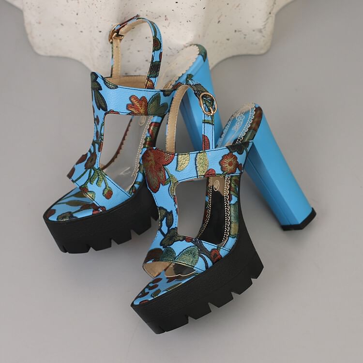 Slingback-Sandalen aus Kunstleder mit Blumenmuster und dickem Absatz