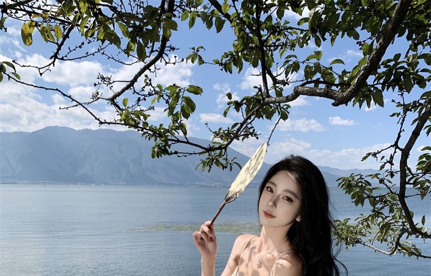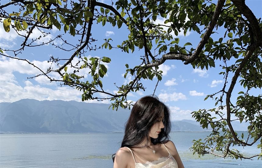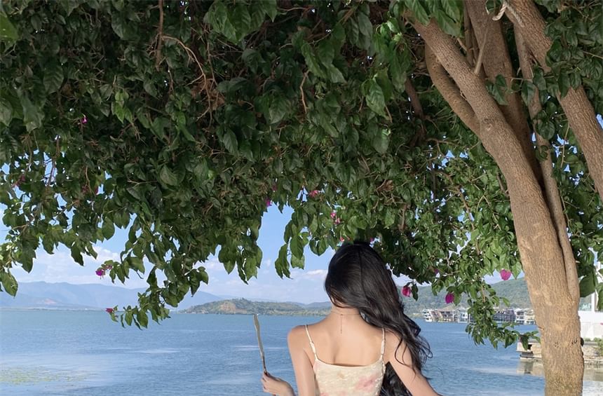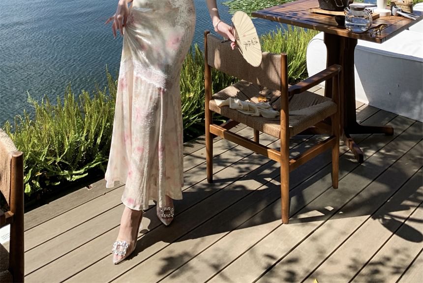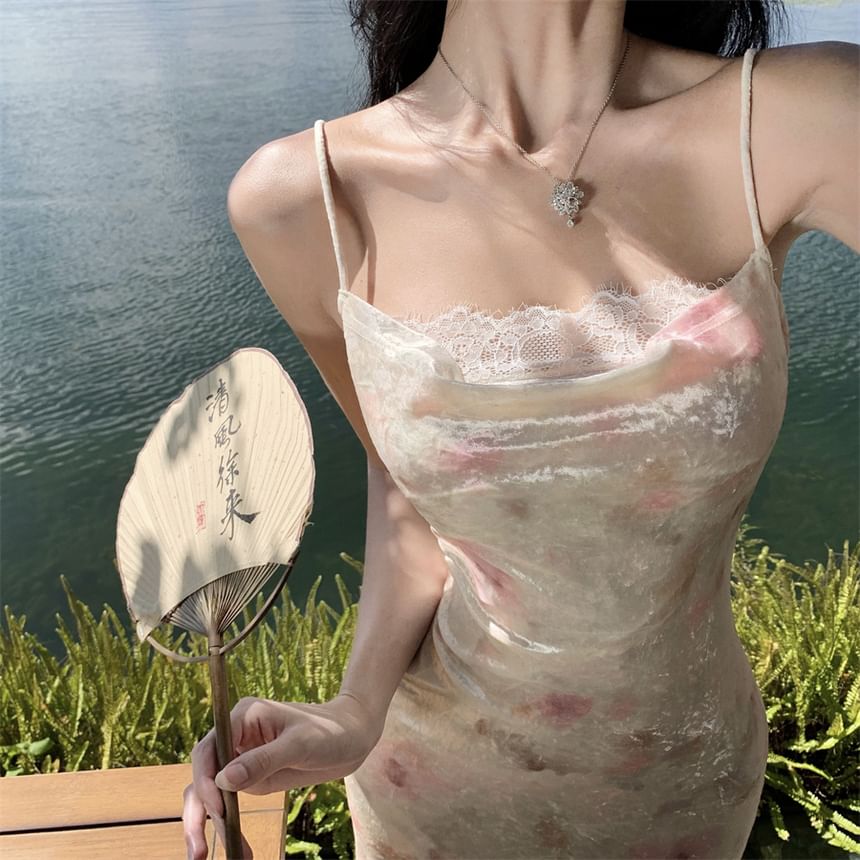 Midi-Meerjungfrauenkleid mit Spaghettiträgern, Blumendruck und Spitzenbesatz