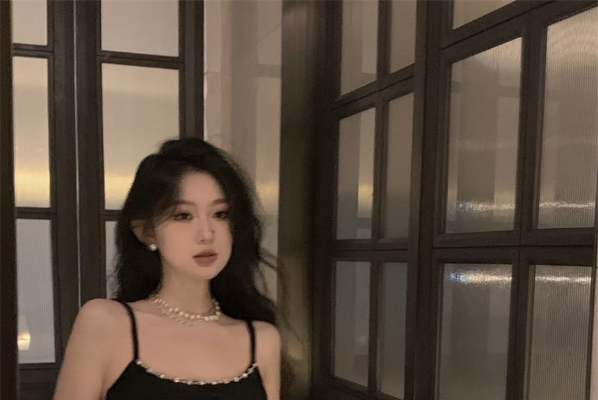 Spaghettiträger-Midi-Etuikleid aus Samt mit Perlenbesatz und Schlitz