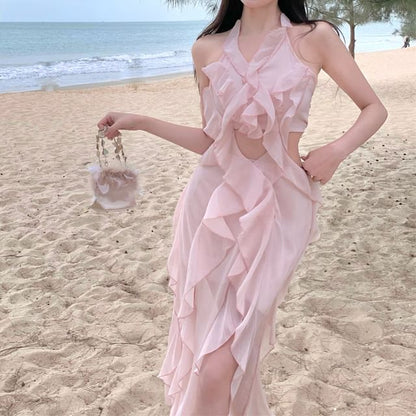 Halter Neck Plain Ruffle Trim Cutout Mini A-Line Dress