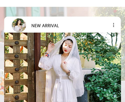 Puff-Sleeve V-Neck Plain Lace Trim Maxi A-Line Dress