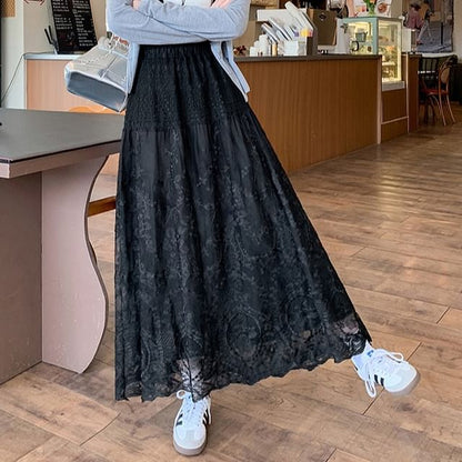 High Waist Flower Embroidered Lace Trim Maxi A-Line Skirt