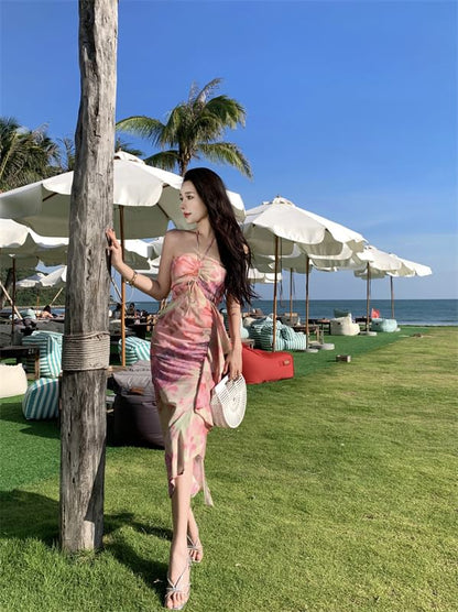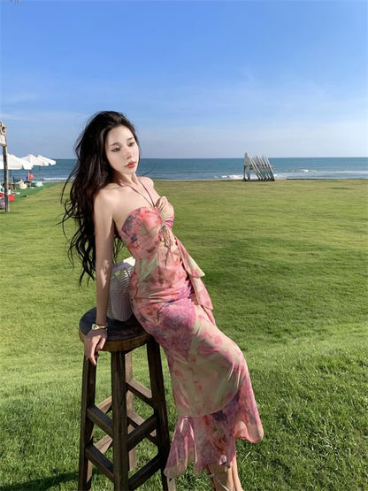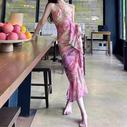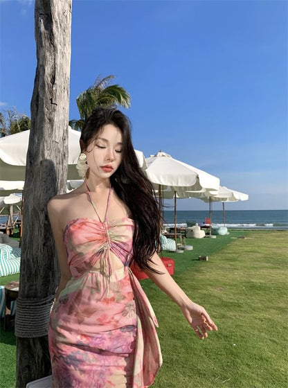 Halter Neck Print Midi Sheath Dress