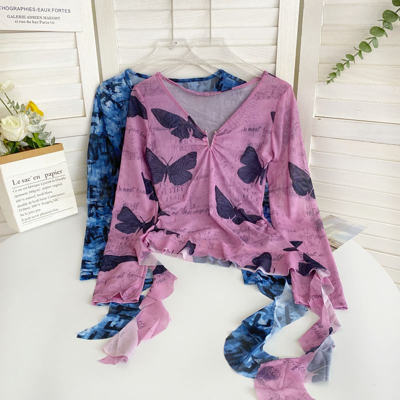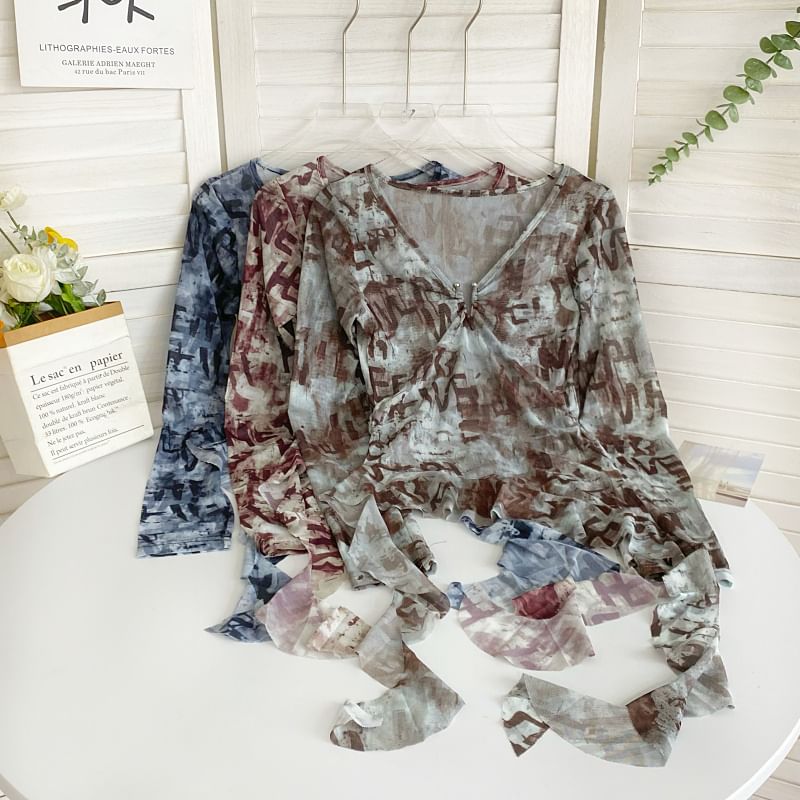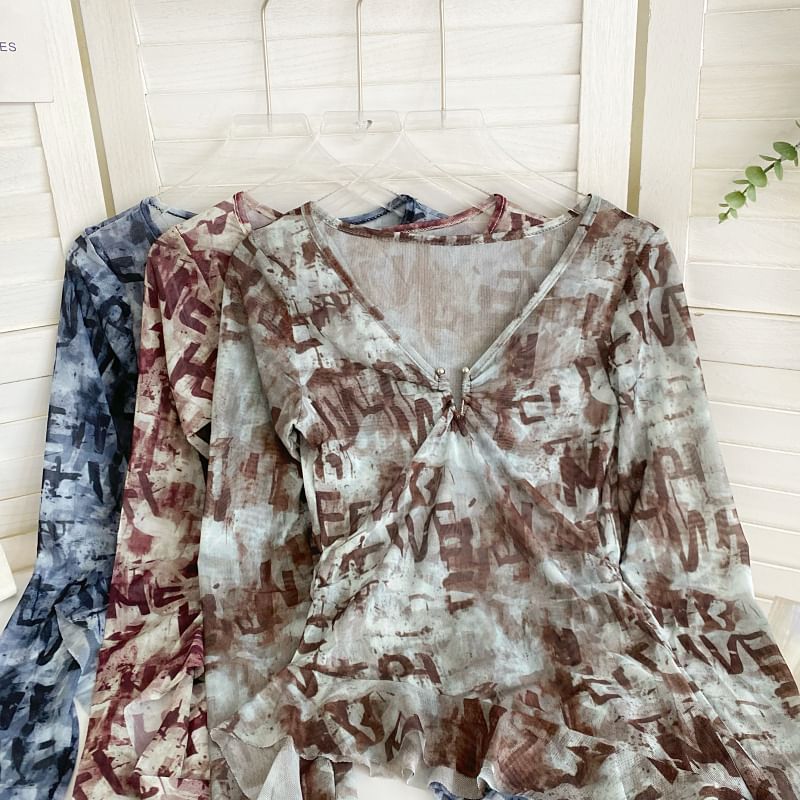 Every product is unique, just like you. If you're looking for a product that fits the mold of your life, the Long-Sleeve V-Neck Print Asymmetrical Mesh Top is for you.