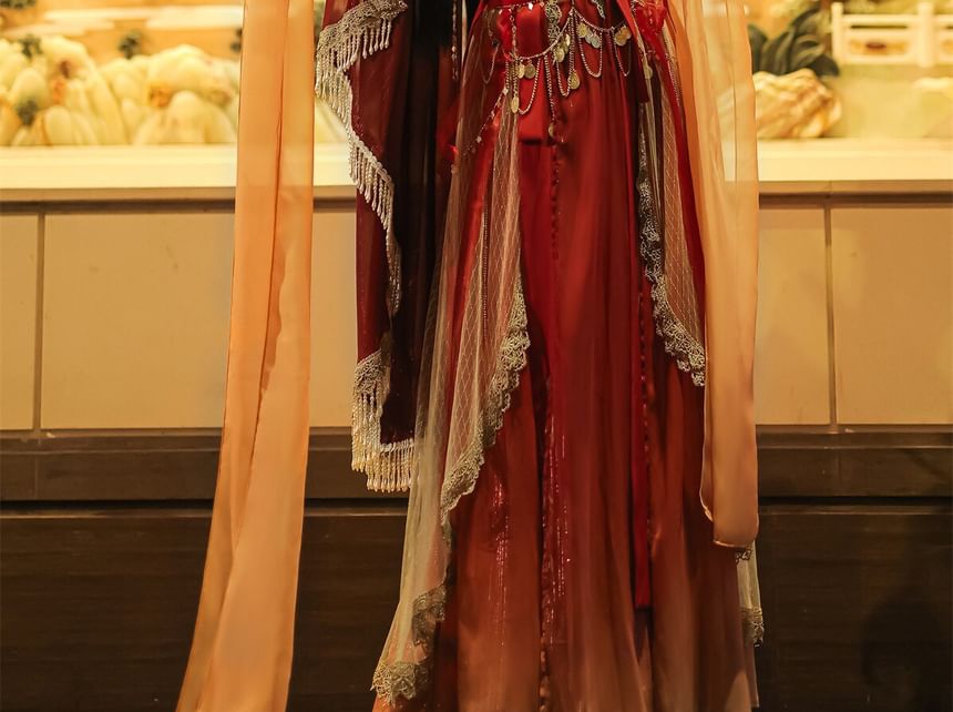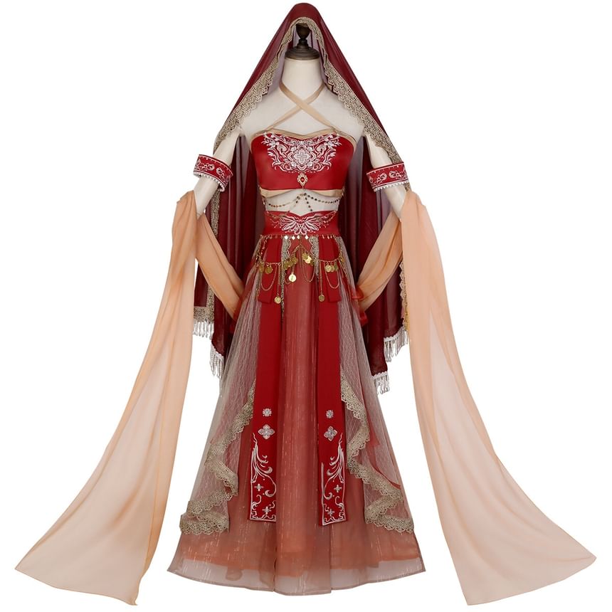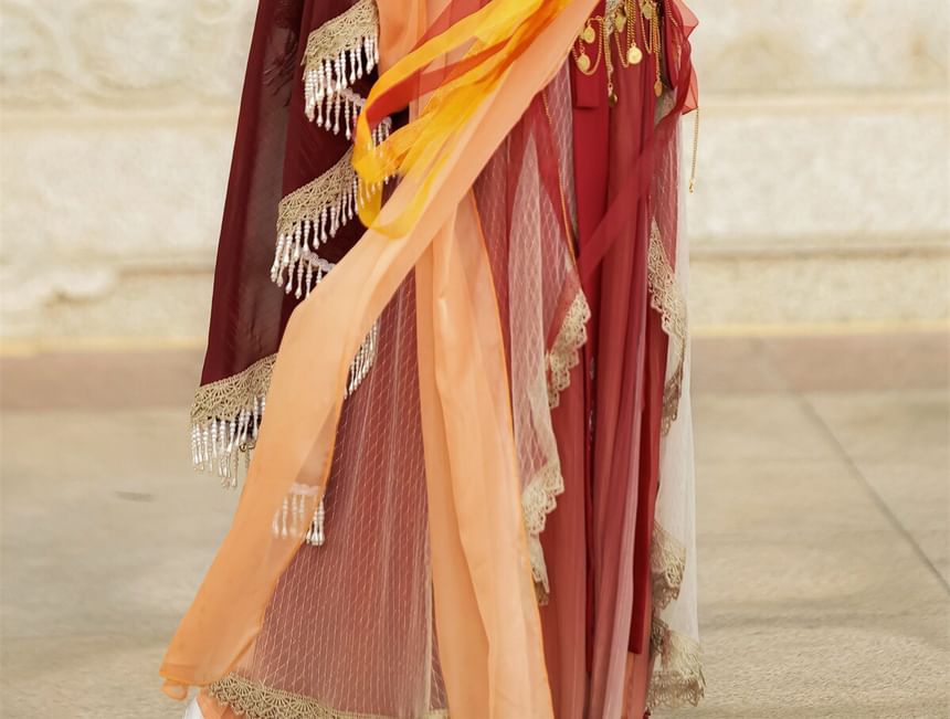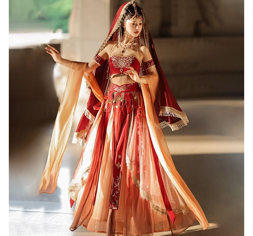 Set of 5 - Top & Skirt & Armlets & Scarf & Veil - White & Red & Milk Tea - Armlets & Scarf & Veil - One Size / Top & Skirt |