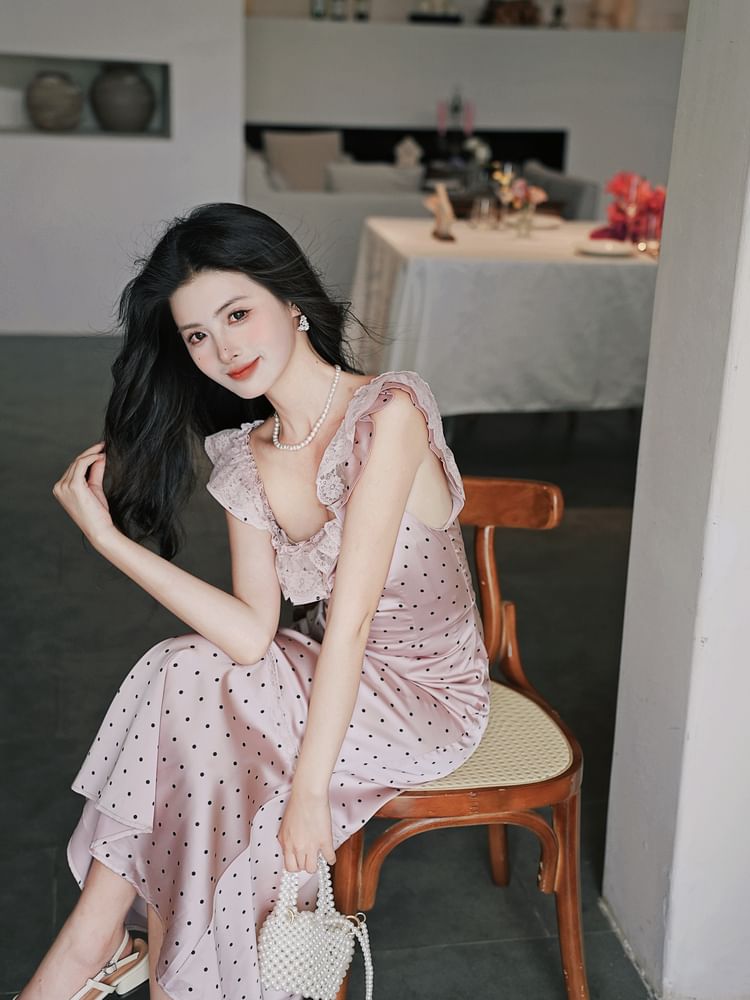 Sleeveless Square Neck Dotted Maxi Mermaid Dress